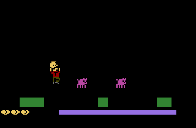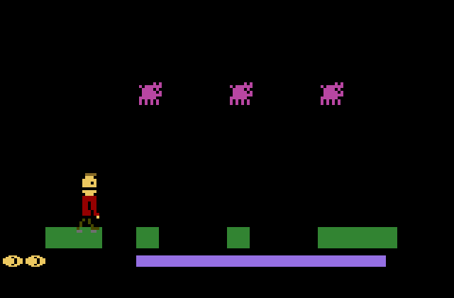 Phillip has been raping the pigs again, but this time, the pigs have banded together and kidnapped Phillip! It's up to Terrance to get his friend back from the evil pigs! The first interesting platform game for the Atari 2600 since H.E.R.O. and Pitfall 2!