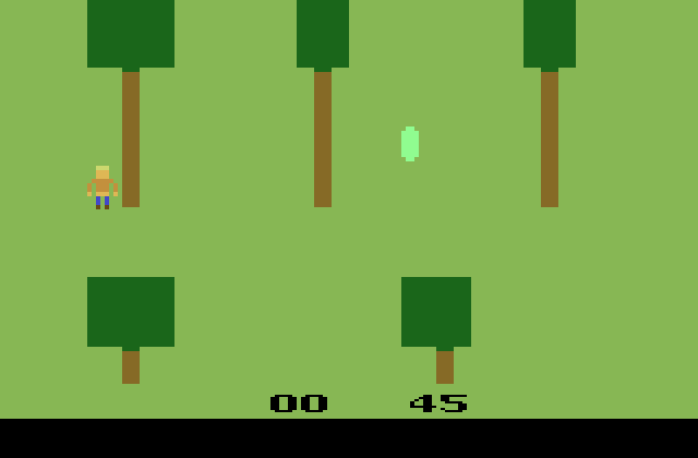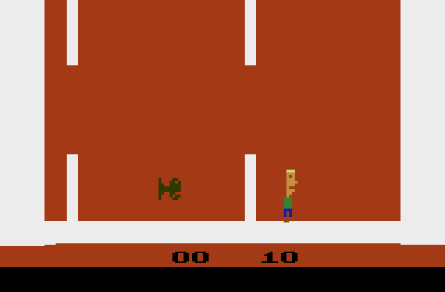 The game starts with Frank chasing the aliens with his gun. Press right to fire and the button to jump. Shoot the alien 20 times to move to level 2.
