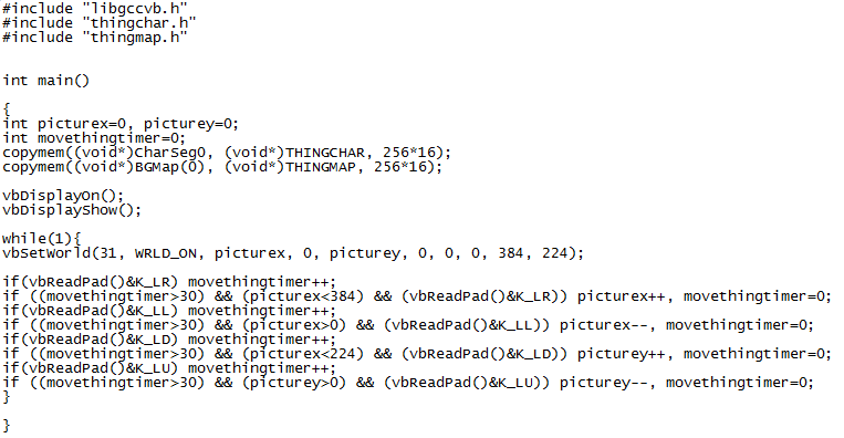The code explained: K_LR is left d-pad right. If you wanted to make it move the right control pad, replace the L with an R. Well, you will probably guess then that L is left, D is down and U is up, but why add a movethingtimer thing? Well, that slows down the movement of the picture. Without it, it would move way too fast. I took the liberty of adding (picturex<384) et al. so the picture would always stay in view. So, what does our code look like now? This: